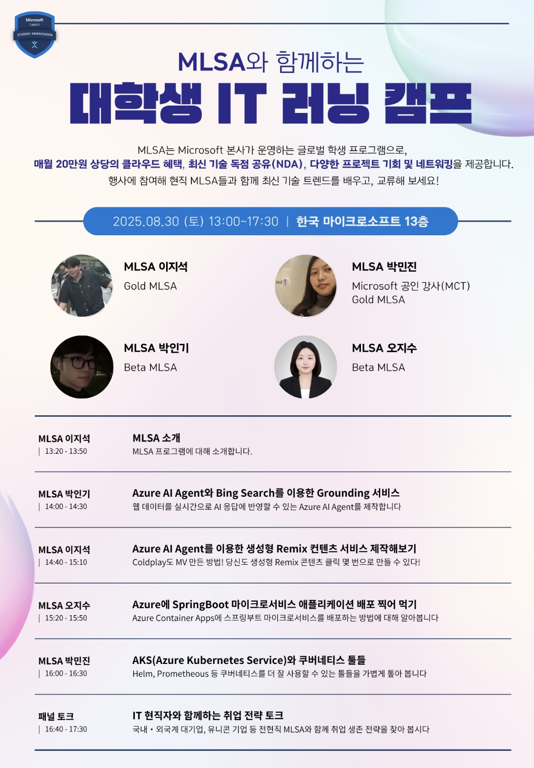안녕하세요! 저는 8월 30일에 MLSA가 주관하는 대학생 IT 러닝 캠프에 참여했는데요.