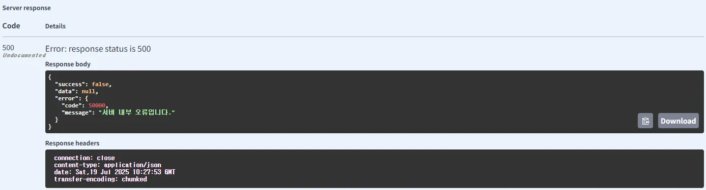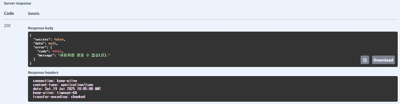 위 구조가 실제로 정상적으로 동작하는지 확인하기 위해 저는 정상 응답 케이스, 커스텀 에러 케이스, 일반 에러 케이스 이렇게 3가지 경우를 테스트 했습니다.