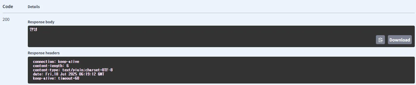 다음과 같이 ResponseBody에 "안녕"이라는 문자열이 제대로 보내진 것을 알 수 있습니다.