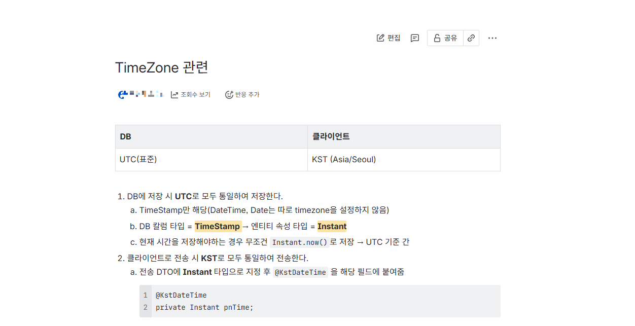 그래서 시간을 DB에는 UTC를 기준으로 저장하고 클라이언트에게 응답할 때만 KST(한국 표준시)로 변환하는 구조를 도입하였습니다.