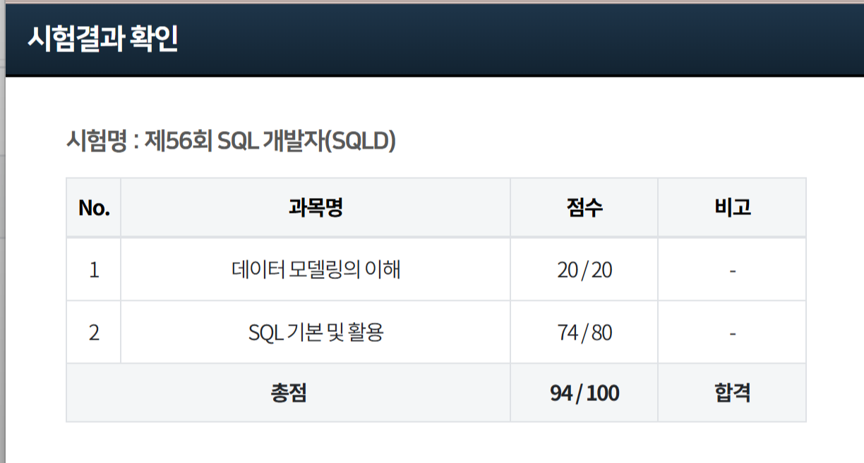 일단 저는 94점이라는 높은 점수로 SQLD를 합격했습니다! :) 애초에 시험 목적이 단순히 시험 통과가 아니라 "휴학 중 앞으로의 의지 다짐 + SQL 마스터" 였기 때문에 더 열심히 공부했던 것도 있습니다.