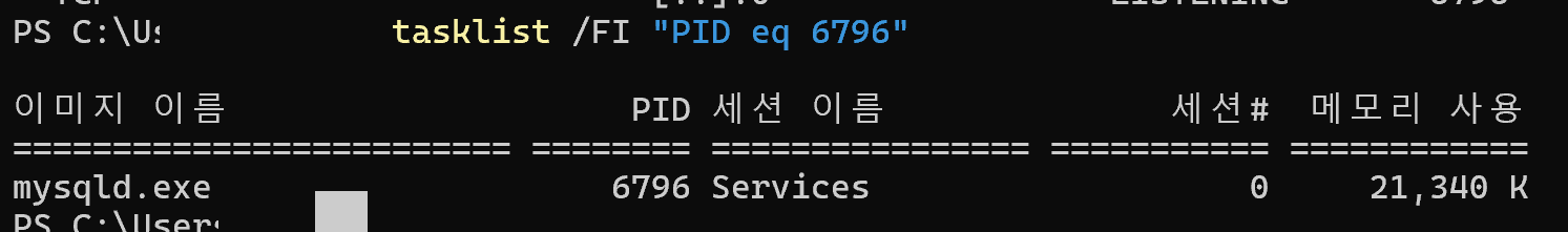 그래서 컨테이너를 종료한 뒤 3306 포트를 점유하고 있는 프로세스를 확인했다.