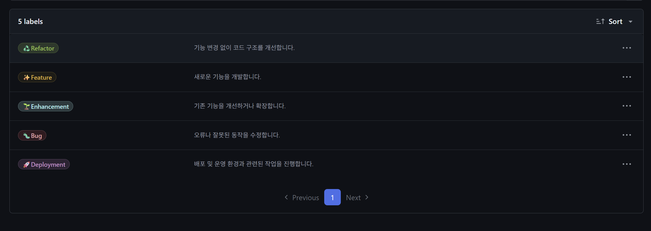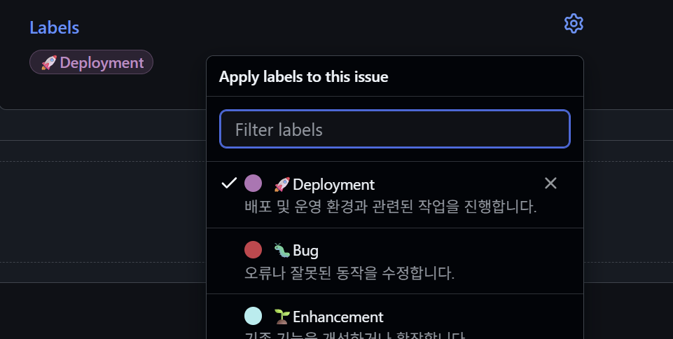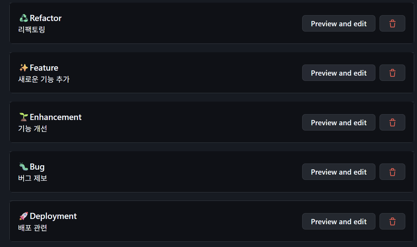 나는 Feature, Enhancement, Refactor, Bug, Deploy 이렇게 5가지로 구분해주었다.