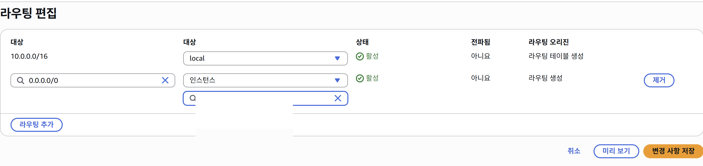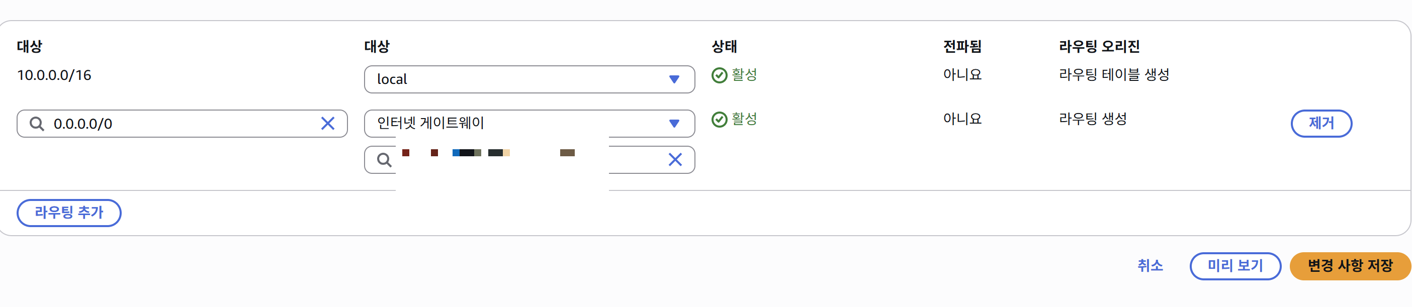 퍼블릭 서브넷에 연결된 라우팅 테이블에 들어가 0.0.0.0/0을 위에서 생성한 인터넷 게이트웨이로 라우팅해준다.