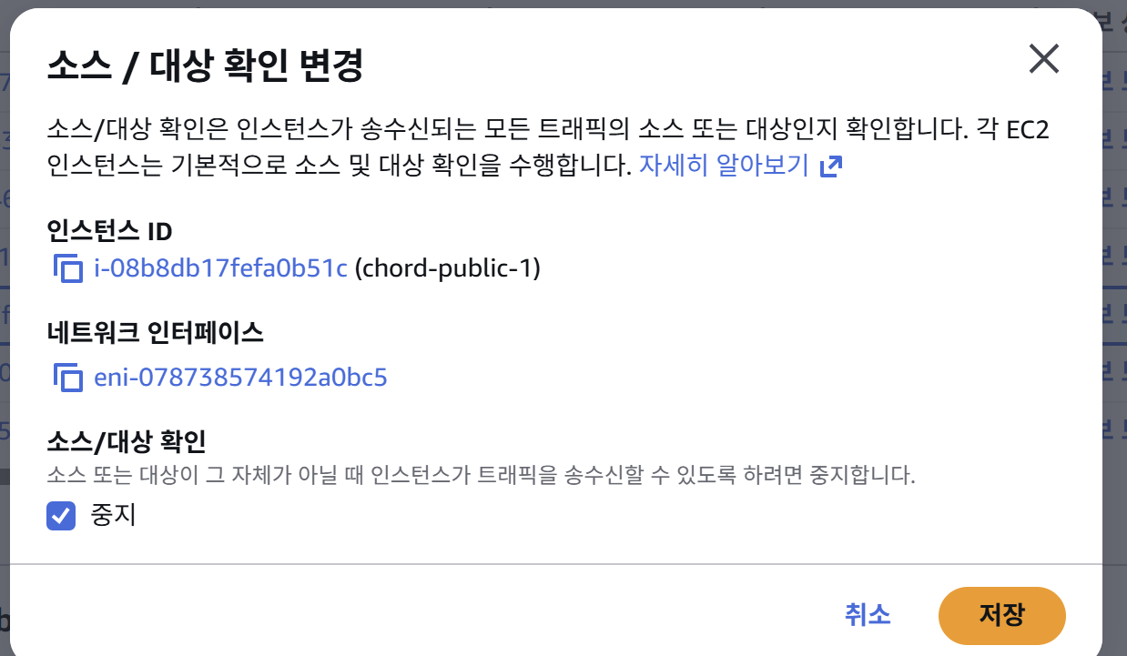 AWS EC2 인스턴스에서 public EC2 인스턴슬르 선택하고 작업 > 네트워킹 > 소스/대상 확인 변경을 설정한 다음